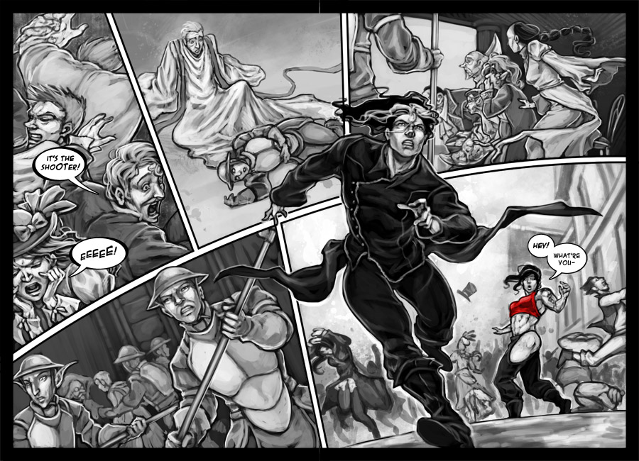 I normally only use 2 page spreads at the beginning of a scene or for an establishing shot, but since there’s a fair bit of stuff going on here, I decided to dedicate to pages to it. It was also a good thing that it just so happened to start on an even page. 🙂